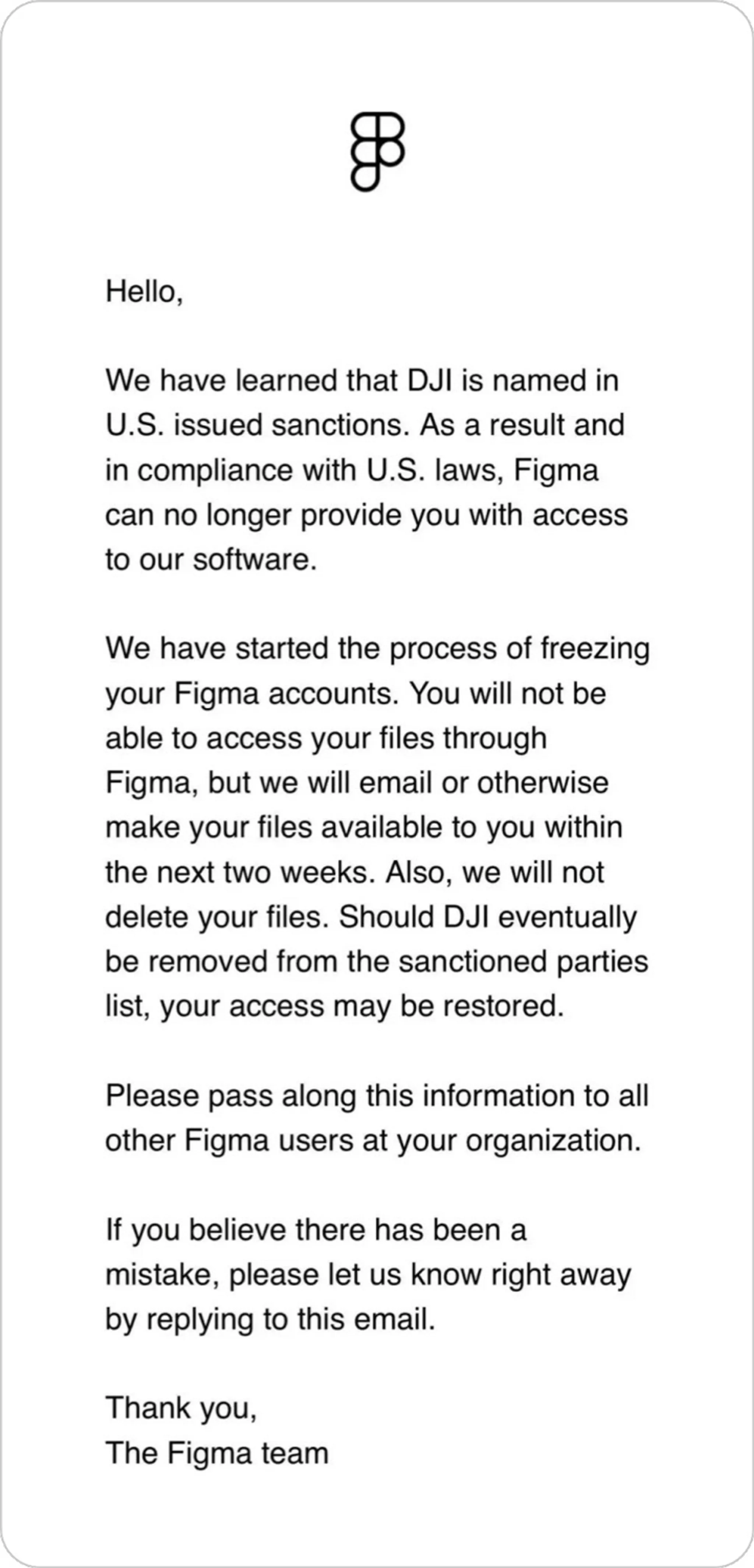 On March 12, the American company Figma — the SaaS provider with the #1 market share in the UI/UX design industry — emailed DJI to notify them that, due to U.S. government sanctions and legal requirements, Figma had frozen DJI's account and would no longer allow DJI to use its services. (Figma's market share surpassed Sketch in 2019.)